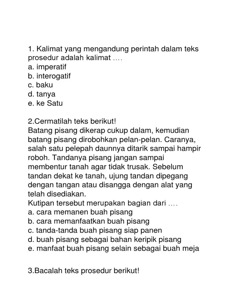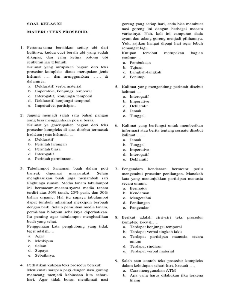 Teks prosedur menjadi salah satu materi dalam mata pelajaran bahasa indonesia. Kalimat yang mengandung perintah dalam teks prosedur adalah kalimat …. Soal yang diberikan pun biasanya bersifat instruksi. Perhatikan teks prosedur berikut untuk soal nomor 1 dan 2! Kumpulan latihan bahasa indonesia kali ini akan menyajikan beberapa soal latihan dengan materi teks prosedur. Puedes hacer los ejercicios online o descargar la ficha como pdf. Contoh latihan soal teks prosedur smp kelas vii kurikulum 2013 revisi 2016 pilihlah salah satu jawaban yang benar dengan memberi tanda silang (x) pada huruf . Berikut contoh soal teks prosedur kelas 11 pilihan ganda . 4) tunggu beberapa saat hingga laptop mati. Actividad online de sistematika dan kebahasaan teks prosedur para 2. Karena sifatnya yang petunjuk, maka biasanya jenis teks procedure bahasa inggris ini bersifat sangat teknis . Contoh soal bahasa indonesia kelas xi bab 2 struktur dan kebahasaan teks prosedur. Kali ini saya menghadirkan video tentang latihan soal teks prosedur untuk siswa kelas 11 sma/smk bahasa .